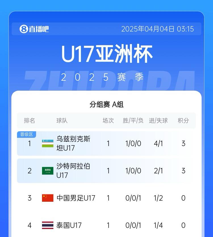 04月04日讯 U17亚洲杯小组赛A组,国少首场1-2不敌沙特,乌兹别克斯坦4-1泰国。